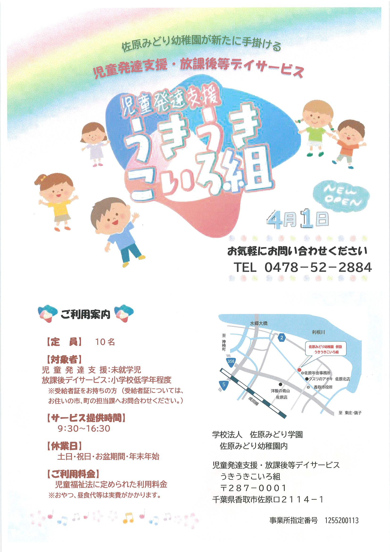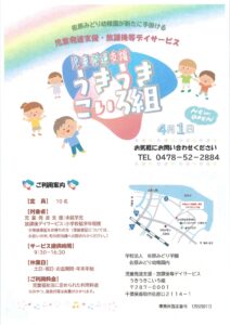 このたび(学)佐原みどり学園では、4月1日より「児童発達支援うきうきこいろ組(障害児通所支援事業)」を開所する運びとなりました。児童発達支援事業と放課後等デイサービス事業を行う施設として千葉県の指定受けたところです。